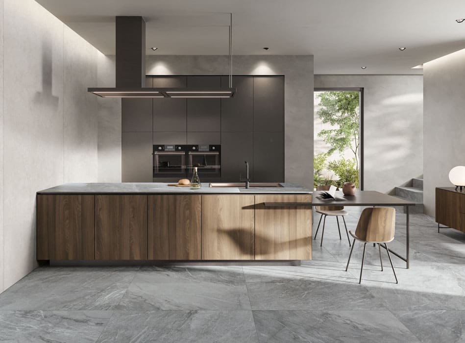 Cooking Surface es la simbiosis perfecta entre la tecnología y los materiales naturales como el porcelánico. Pues lo que en un inicio parece solo la perfecta imagen de este acabado, esconde en su interior un sistema de inducción que entra en funcionamiento cuando un recipiente metálico entra en contacto con su campo magnético.